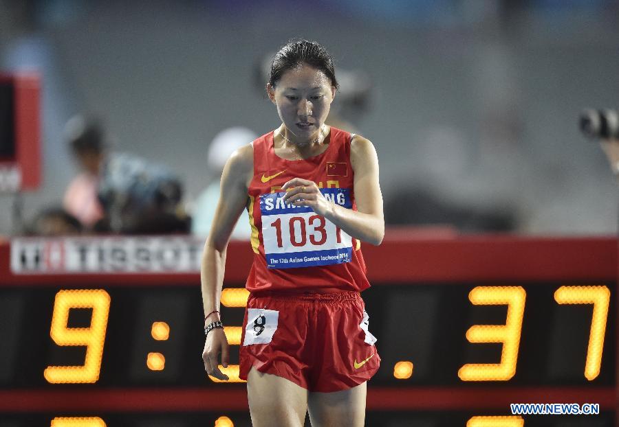 Li Zhenzhu of China competes during the women's 3,000m steeplechase final match of athletics at the 17th Asian Games in Incheon, South Korea, Sept. 27, 2014. Li Zhenzhu won gold medal with 9 minutes and 35.23 seconds. (Xinhua/Lui Siu Wai)