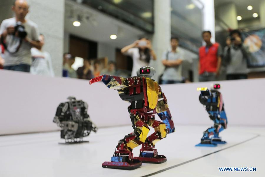 Robots dance during the second college students robot competition of north China's Tianjin Municipality, Sept. 28, 2014. Teams from nine universities and colleges participated in the competition which kicked off at Tianjin Polytechnic University Sunday. (Xinhua) |