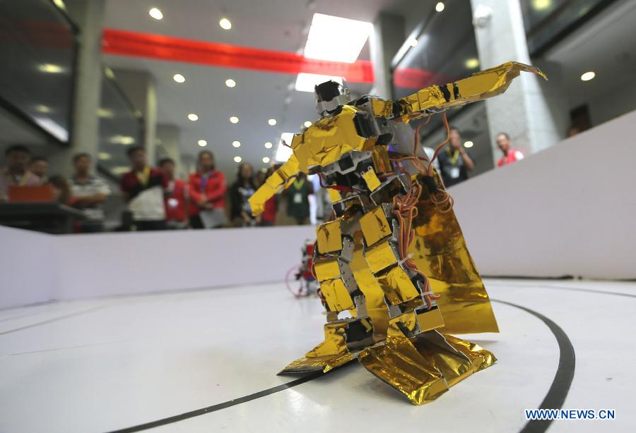 A robot dances during the second college students robot competition of north China's Tianjin Municipality, Sept. 28, 2014. Teams from nine universities and colleges participated in the competition which kicked off at Tianjin Polytechnic University Sunday. (Xinhua)