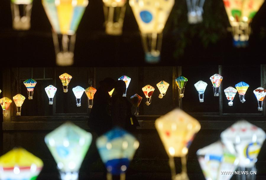 People view colorful lanterns at Tiehua Music Village in Taitung, southeast China's Taiwan, late Sept. 28, 2014. Artists and locals made and painted some 3,000 hot-air-balloon-shaped lanterns this summer to decorate the nearby meadow of the village, echoing the annual balloon fiesta of the city. (Xinhua/Wang Qingqin) |
