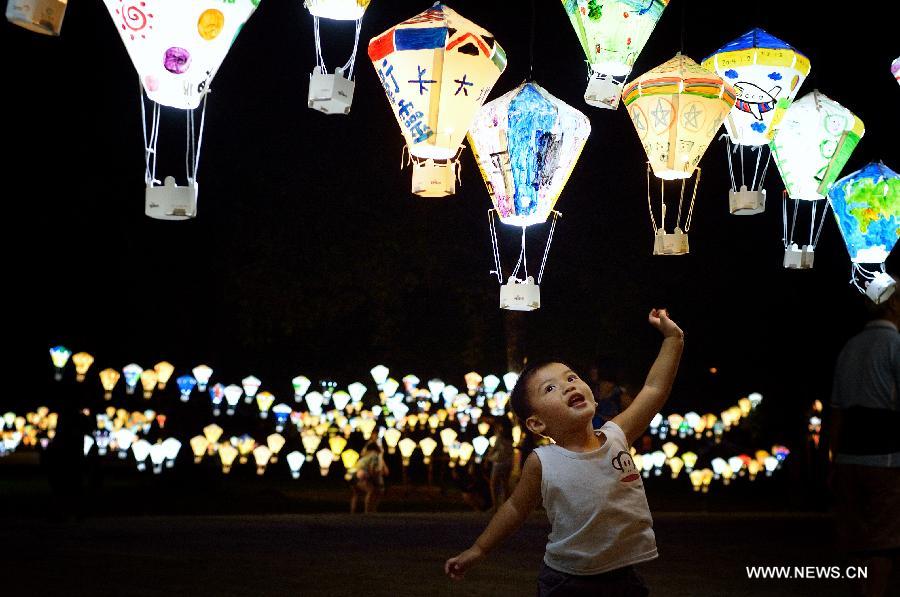 A child is attracted by colorful lanterns at Tiehua Music Village in Taitung, southeast China's Taiwan, late Sept. 28, 2014. Artists and locals made and painted some 3,000 hot-air-balloon-shaped lanterns this summer to decorate the nearby meadow of the village, echoing the annual balloon fiesta of the city. (Xinhua/Wang Qingqin) |
