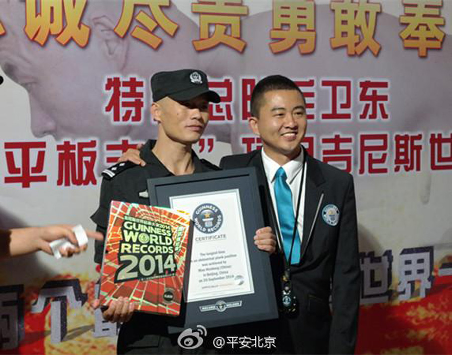 As reported by the official microblog site of Beijing Public Security Bureau on Sept. 26, Mao Weidong, a 43-year-old Special Weapons and Tactics (SWAT) member, breaks the Guinness World Record for "longest time in an abdominal plank position" with a record of four hours and twenty six minutes, smashing the previous three hours and seven minutes one set in 2013. "He wins not only physically, but also mentally! We are here cheering for him! Beijing SWAT Unit will always dedicate to ensure social security, preserve public order, protect people's lives as well as property and security of the capital," says the site. (Photo/weibo.com)
