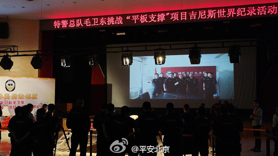 As reported by the official microblog site of Beijing Public Security Bureau on Sept. 26, Mao Weidong, a 43-year-old Special Weapons and Tactics (SWAT) member, breaks the Guinness World Record for "longest time in an abdominal plank position" with a record of four hours and twenty six minutes, smashing the previous three hours and seven minutes one set in 2013. "He wins not only physically, but also mentally! We are here cheering for him! Beijing SWAT Unit will always dedicate to ensure social security, preserve public order, protect people's lives as well as property and security of the capital," says the site. (Photo/weibo.com)