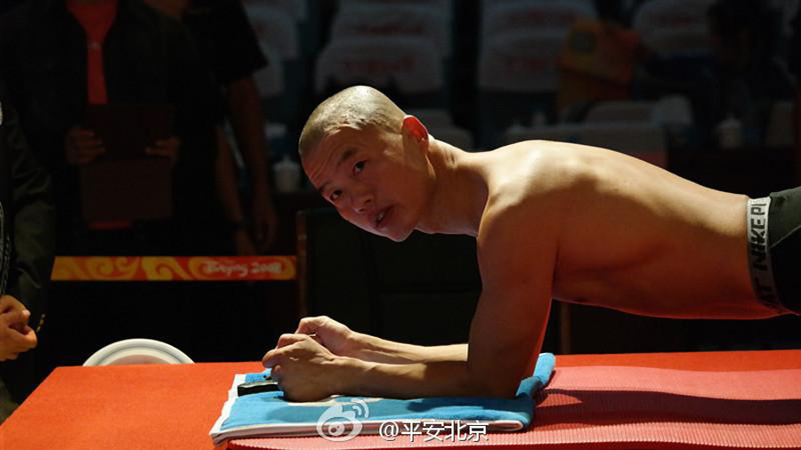 As reported by the official microblog site of Beijing Public Security Bureau on Sept. 26, Mao Weidong, a 43-year-old Special Weapons and Tactics (SWAT) member, breaks the Guinness World Record for "longest time in an abdominal plank position" with a record of four hours and twenty six minutes, smashing the previous three hours and seven minutes one set in 2013. "He wins not only physically, but also mentally! We are here cheering for him! Beijing SWAT Unit will always dedicate to ensure social security, preserve public order, protect people's lives as well as property and security of the capital," says the site. (Photo/weibo.com)