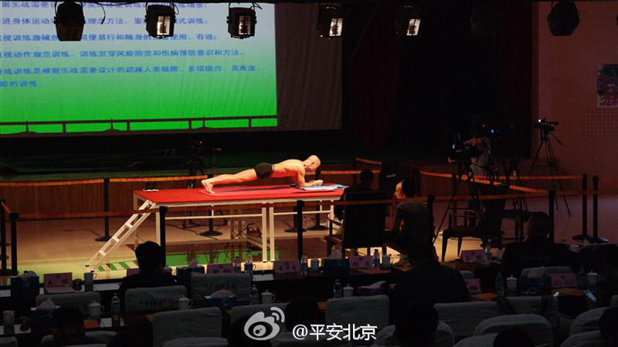As reported by the official microblog site of Beijing Public Security Bureau on Sept. 26, Mao Weidong, a 43-year-old Special Weapons and Tactics (SWAT) member, breaks the Guinness World Record for "longest time in an abdominal plank position" with a record of four hours and twenty six minutes, smashing the previous three hours and seven minutes one set in 2013. "He wins not only physically, but also mentally! We are here cheering for him! Beijing SWAT Unit will always dedicate to ensure social security, preserve public order, protect people's lives as well as property and security of the capital," says the site. (Photo/weibo.com)