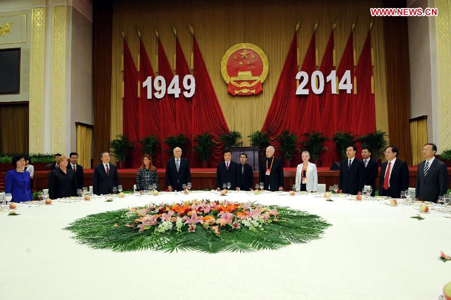 Liu Yunshan (C), a member of the Standing Committee of the Political Bureau of the Communist Party of China (CPC) Central Committee and secretary of the Secretariat of the CPC Central Committee, attends a reception for foreign experts on the eve of the 65th anniversary of the founding of new China, at the Great Hall of the People in Beijing, capital of China, Sept. 28, 2014. (Xinhua/Rao Aimin) |