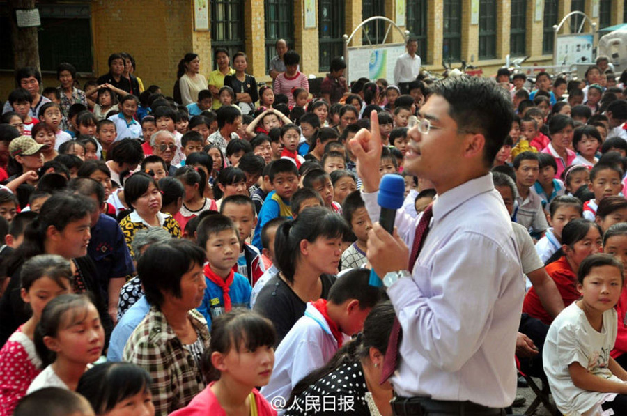 Guided by the speaker, hundreds of students, parents and teachers lose control of their emotions at a speech event with the theme "Be thankful to parents and teachers" held in a primary school in Chiping County in Shandong province on Sept. 25, 2014. (Photo/Dayoo.com)