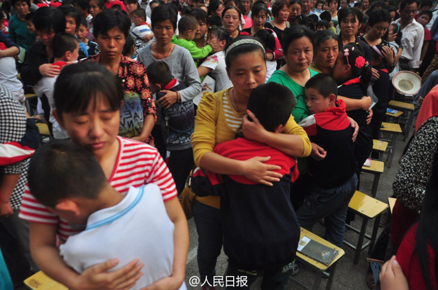 Guided by the speaker, hundreds of students, parents and teachers lose control of their emotions at a speech event with the theme "Be thankful to parents and teachers" held in a primary school in Chiping County in Shandong province on Sept. 25, 2014. (Photo/Dayoo.com)