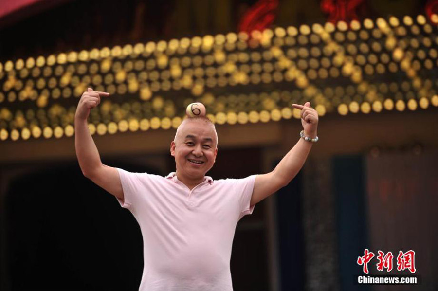 A man puts an apple marked with "6" on his head. (CNS/Chen Chao)