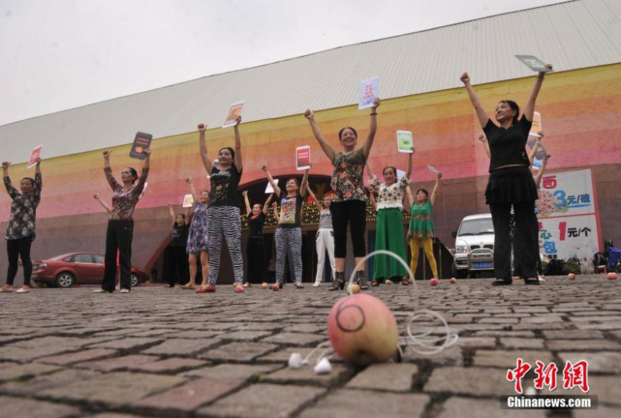 Holding paper models of iPhone6, damas dance to music "Little Apple" in the Foreigner Street in Chongqing on Sept. 26, 2014. They wanted to call for rational consumption on iPhone 6 through their dance. (CNS/Chen Chao)
