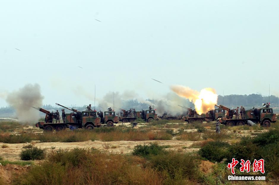 Nearly 6,000 troops of over 20 units from PLA Navy North Sea Fleet and Jinan Military Area Command conduct the "Joint-2014B" military drill in Bohai Bay from Sept. 25 to Sept. 27, 2014. (Chinanews.com/Qiu Chengliang)