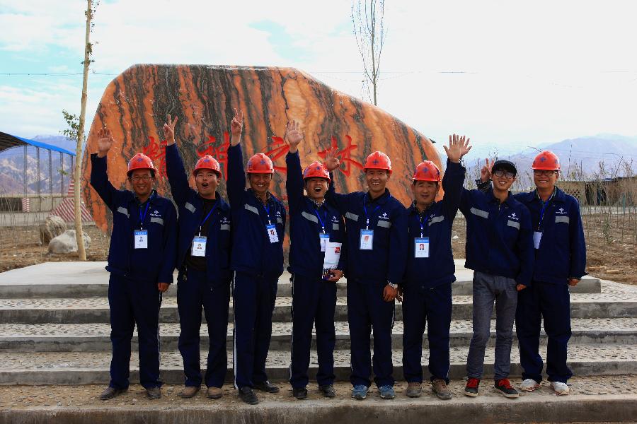 Photo taken on Sept. 16, 2014 shows the highway constructors posing for group photo in front of a monument in the Qaidam Basin in northwest China's Qinghai Province. With their efforts, a new highway linking Beijing to Golmud is scheduled to open to traffic in 2015. The year of 2014 marks the 60th anniversary of the opening of the Qinghai-Tibet highway. The highway, linking Xining, capital city of Qinghai province, and Lhasa, capital of the Tibet Autonomous Region, is a lifeline for Qinghai-Tibet Plateau. It boosts economic growth of regions along the road and makes lots of people's dreams come true. (Xinhua/Guo Qiuda) |