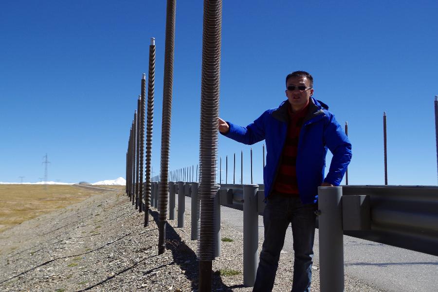 Photo taken on Sept. 19, 2014 shows Liu Ge, a researcher of frozen soil, standing on the Hol Xil part of Qinghai-Tibet highway, northwest China's Qinghai Province. In the past 12 years, Liu Ge worked on the Qinghai-Tibet Plateau every year from May to October, collecting data of frozen soil and meteorology. The year of 2014 marks the 60th anniversary of the opening of the Qinghai-Tibet highway. The highway, linking Xining, capital city of Qinghai province, and Lhasa, capital of the Tibet Autonomous Region, is a lifeline for Qinghai-Tibet Plateau. It boosts economic growth of regions along the road and makes lots of people's dreams come true. (Xinhua/Guo Qiuda) |