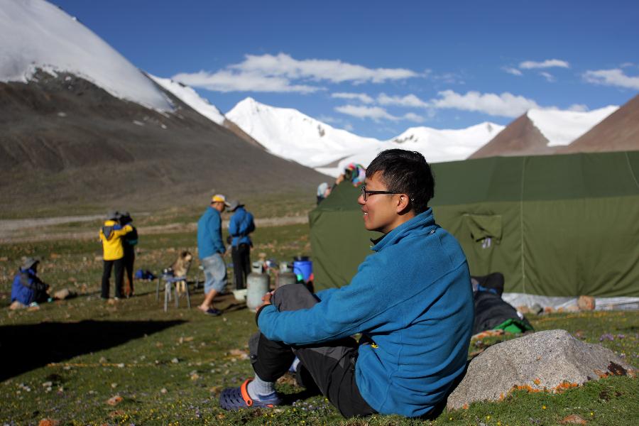 Photo taken on July 18, 2014 shows Zhang Mohan, team leader of Mountaineering Association of Peking University, having a rest in the base camp at the foot of Geladaindong Mountain, northwest China's Qinghai Province. His team reached the top of the 6,621-meter-high Geladaindong Peak this year. The year of 2014 marks the 60th anniversary of the opening of the Qinghai-Tibet highway. The highway, linking Xining, capital city of Qinghai province, and Lhasa, capital of the Tibet Autonomous Region, is a lifeline for Qinghai-Tibet Plateau. It boosts economic growth of regions along the road and makes lots of people's dreams come true. (Xinhua/Guo Qiuda) |