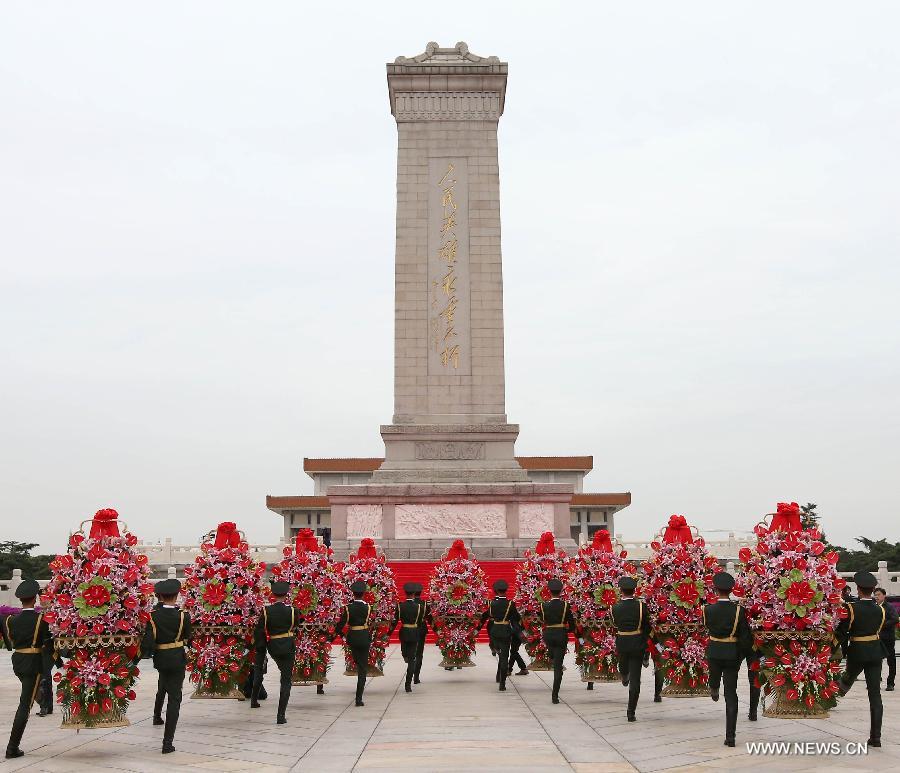 Soldiers present flower baskets to the deceased national heroes at the Monument to the People's Heroes in Tian'anmen Square, downtown Beijing, capital of China, Sept. 30, 2014, on the occasion of the first Martyrs' Day. China's top legislature set Sept. 30 as Martyrs' Day last month. (Xinhua/Pang Xinglei)