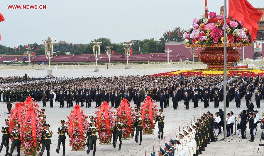 Chinese leaders Xi Jinping, Li Keqiang, Zhang Dejiang, Yu Zhengsheng, Liu Yunshan, Wang Qishan and Zhang Gaoli offer flower baskets at the Monument to the People's Heroes in Beijing's Tian'anmen Square on Sept. 30, 2014, the first Martyrs' Day. (Xinhua/Liu Jiansheng) |