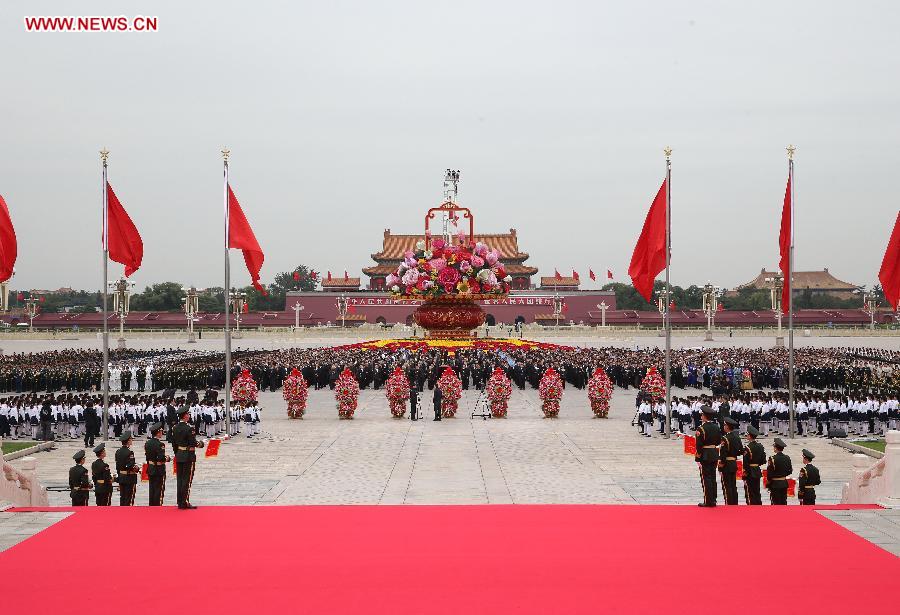 Chinese leaders Xi Jinping, Li Keqiang, Zhang Dejiang, Yu Zhengsheng, Liu Yunshan, Wang Qishan and Zhang Gaoli offer flower baskets at the Monument to the People's Heroes in Beijing's Tian'anmen Square on Sept. 30, 2014, the first Martyrs' Day. (Xinhua/Yao Dawei) |