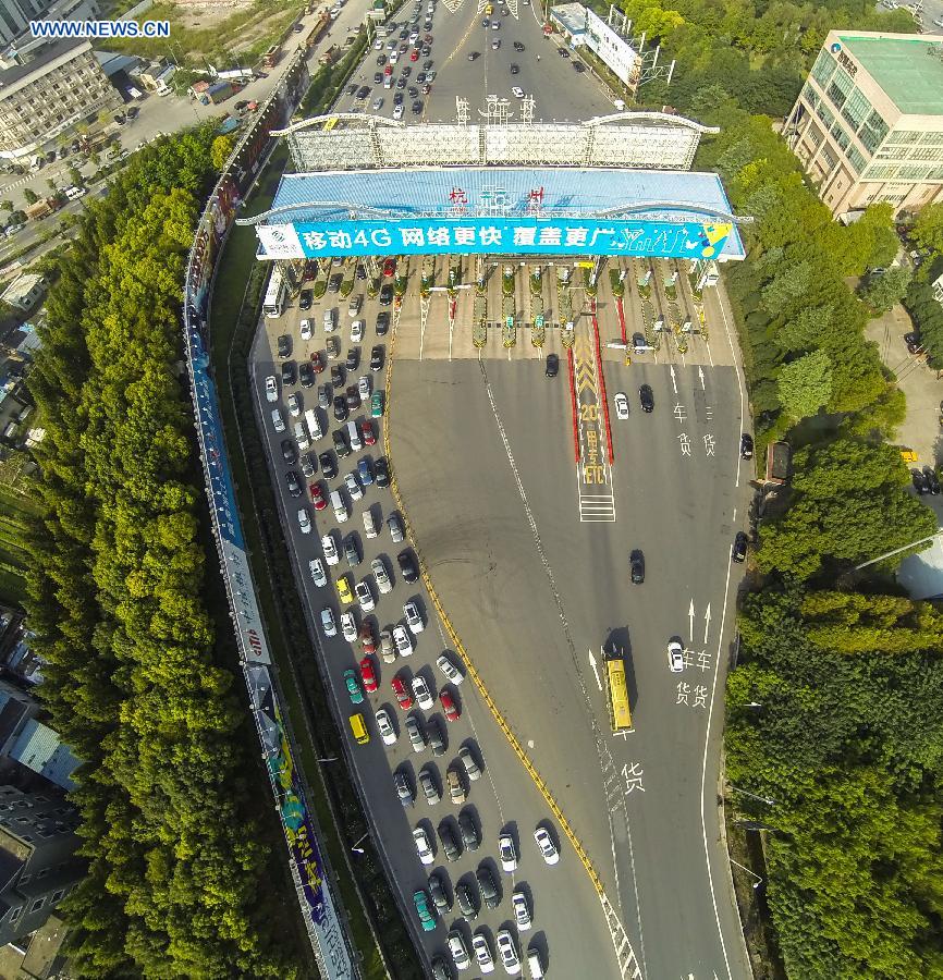 A traffic stream for going out of town makes a sharp contrast with an empty driveway for entering town at a toll station of express way on the first day of the Chinese National Day holidays in Hangzhou, capital of east China's Zhejiang Province, Oct. 1, 2014. The "golden-week" National Day holidays are expected to bring a tourism peak across the country. (Xinhua/Xu Yu) |
