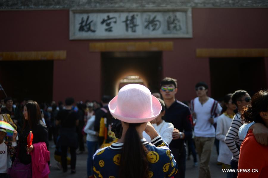 A tourist poses for photo outside the northern gate of the Palace Museum on the second day of the Chinese National Day holidays in Beijing, capital of China, Oct. 2, 2014. Almost all scenic spots in Beijing were packed with tourists on the second day of the National Day holidays, which falls from Oct. 1 to Oct. 7. The 26 mainly monitored scenic spots of Beijing received 542,000 trips on Oct. 1, up 32.8 percent over the same day of last year. (Xinhua/Jin Liangkuai) |