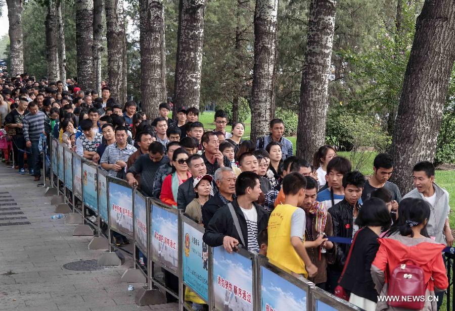 A road to the Tian'anmen square is crammed with tourists on the second day of the Chinese National Day holidays in Beijing, capital of China, Oct. 2, 2014. Almost all scenic spots in Beijing were packed with tourists on the second day of the National Day holidays, which falls from Oct. 1 to Oct. 7. The 26 mainly monitored scenic spots of Beijing received 542,000 trips on Oct. 1, up 32.8 percent over the same day of last year. (Xinhua/Luo Xiaoguang)