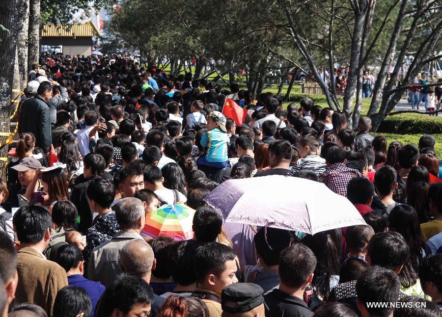 A road to the Tian'anmen square is crammed with tourists on the second day of the Chinese National Day holidays in Beijing, capital of China, Oct. 2, 2014. Almost all scenic spots in Beijing were packed with tourists on the second day of the National Day holidays, which falls from Oct. 1 to Oct. 7. The 26 mainly monitored scenic spots of Beijing received 542,000 trips on Oct. 1, up 32.8 percent over the same day of last year. (Xinhua/Luo Xiaoguang) |