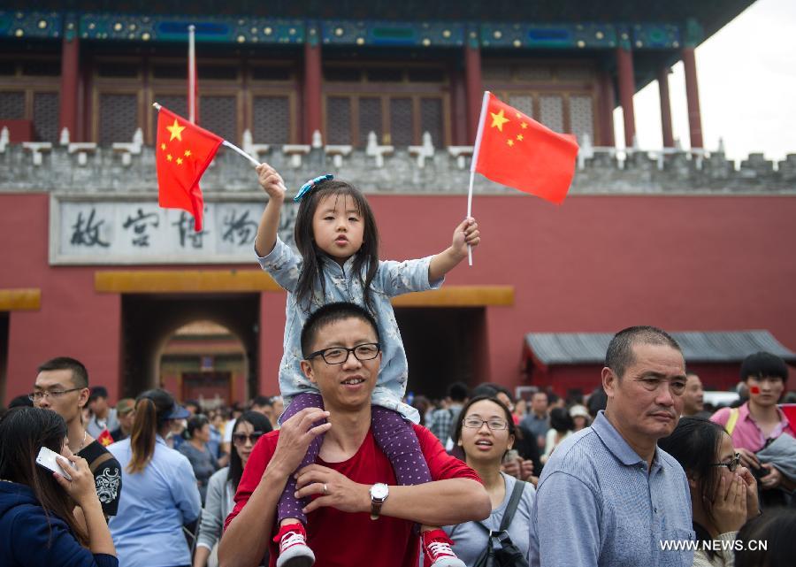 A child rides her parent as she visits the northern gate of the Palace Museum on the second day of the Chinese National Day holidays in Beijing, capital of China, Oct. 2, 2014. Almost all scenic spots in Beijing were packed with tourists on the second day of the National Day holidays, which falls from Oct. 1 to Oct. 7. The 26 mainly monitored scenic spots of Beijing received 542,000 trips on Oct. 1, up 32.8 percent over the same day of last year. (Xinhua/Luo Xiaoguang) |