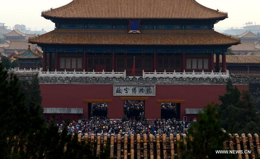 The northern gate of the Palace Museum is crammed with tourists on the second day of the Chinese National Day holidays in Beijing, capital of China, Oct. 2, 2014. Almost all scenic spots in Beijing were packed with tourists on the second day of the National Day holidays, which falls from Oct. 1 to Oct. 7. The 26 mainly monitored scenic spots of Beijing received 542,000 trips on Oct. 1, up 32.8 percent over the same day of last year. (Xinhua/Jin Liangkuai) |