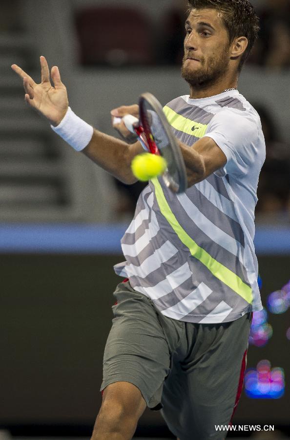 Martin Klizan of Slovakia returns the ball during the men's singles quarterfinal match against Rafael Nadal of Spain at the China Open tennis tournament in Beijing, China, Oct. 3, 2014. Klizan won 2-1. (Xinhua/Zhang Yu)