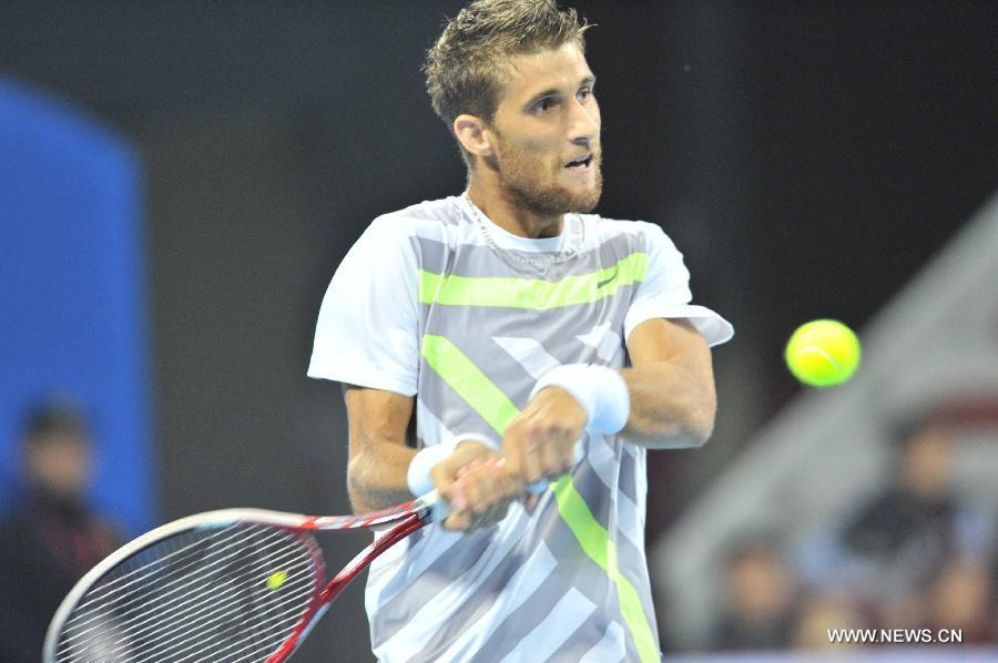 Martin Klizan of Slovakia returns the ball during the men's singles quarterfinal match against Rafael Nadal of Spain at the China Open tennis tournament in Beijing, China, Oct. 3, 2014. Klizan won 2-1. (Xinhua/Li Wen)