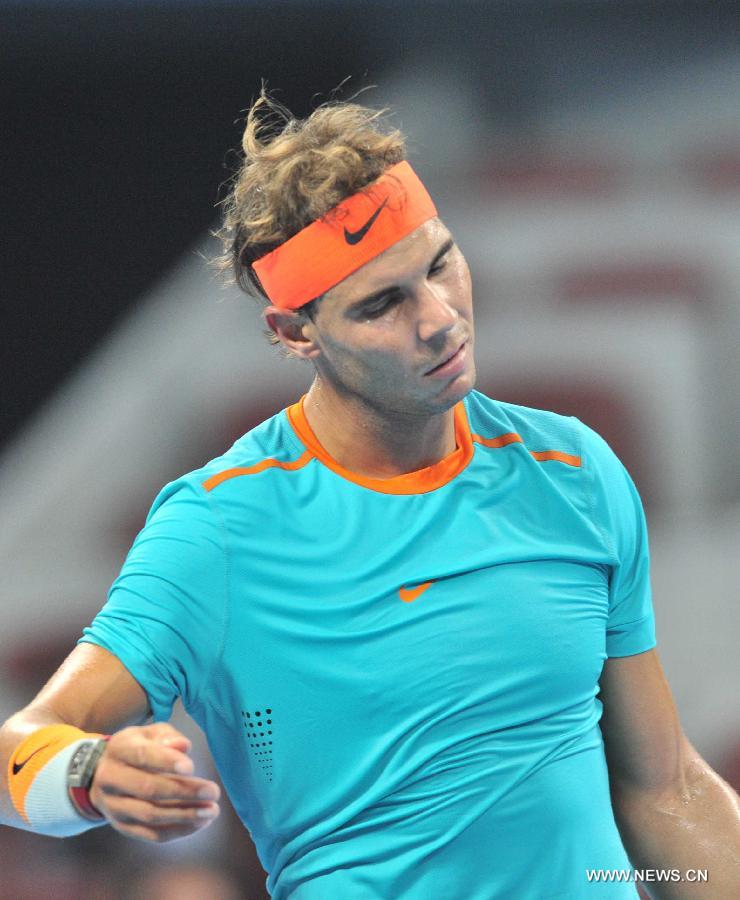 Rafael Nadal of Spain reacts during the men's singles quarterfinal match against Martin Klizan of Slovakia at the China Open tennis tournament in Beijing, China, Oct. 3, 2014. Nadal lost 1-2. (Xinhua/Li Wen)