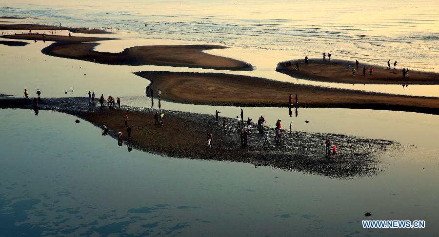 People enjoy themselves on the shoals in Qinhuangdao City, north China's Hebei Province, Oct. 4, 2014. Many people came to Qinhuangdao, a famous tourist city in north China, during the seven-day National Day holiday. (Xinhua/Yang Shiyao) |