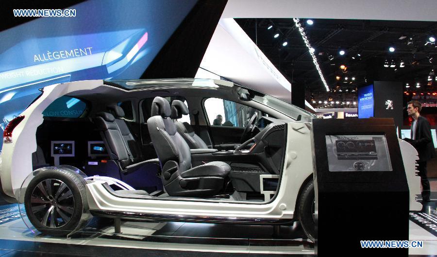 A man looks at a car during the 2014 international car exhibition in Paris, France, on Oct.4, 2014. The 2014 international car exhibition opened its doors to the public on Oct. 4, inviting people to be the first to see new models and check out the latest innovative technology of more than 260 car manufacturers from 18 countries and regions. (Xinhua/Zheng Bin) |