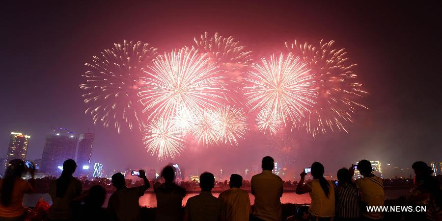 People watch the fireworks at a music fireworks gala celebrating the National Day by the riverside of Xiangjiang River in Changsha, capital of central China's Hunan Province, Oct. 4, 2014. (Xinhua/Long Hongtao)