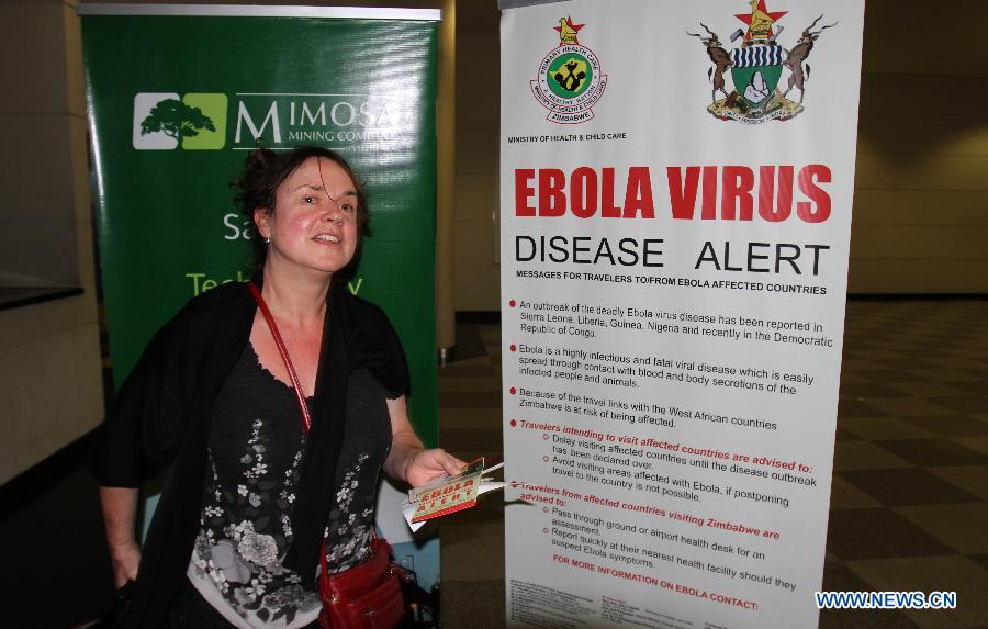 A passenger holds a pamphlet on ebola prevention as she arrives at Harare International Airport, Zimbabwe, Oct. 6, 2014. A Zimbabwean mining firm called Mimosa recently donated 100,000 U.S. dollars of scanners, television sets and cameras to the ministry of Health to help keep Ebola out of the country. Ebola has claimed nearly 3,000 lives in West Africa. Zimbabwe has so far not recorded any case of the fatal disease. (Xinhua) |