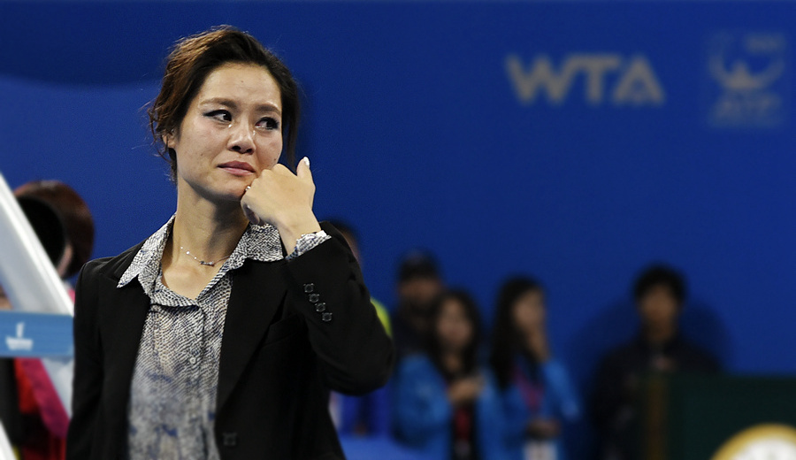 China's tennis trailblazer Li Na bid farewell to the court in a tearful ceremony at the China Open. (Li Zhenyu/People's Daily Online)