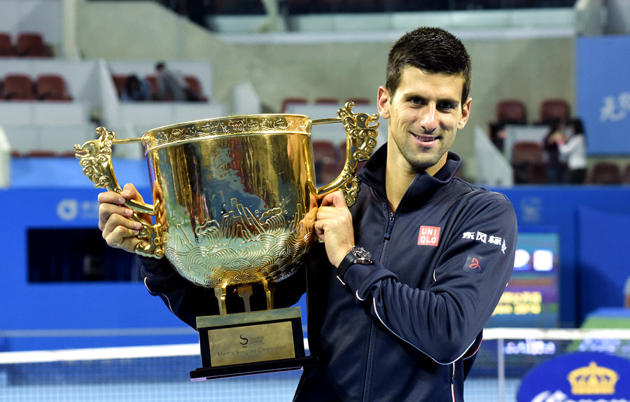 World No. 1 Novak Djokovic poses with the China Open trophy after winning his fifth title in Beijing on Sunday. (Li Zhenyu/People’s Daily Online)