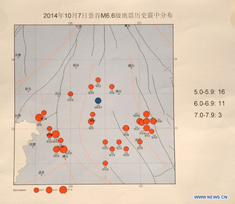 Photo taken on Oct. 7, 2014 shows the historical epicenter location information map of Jinggu County earthquake at the Seismological Bureau of Yunnan Province in Kunming, capital of southwest China's Yunnan Province. A 6.6-magnitude earthquake jolted Jinggu County of Pu'er City in Yunnan at 9:49 p.m. Beijing Time (1349 GMT), according to the China Earthquake Networks Center (CENC). (Xinhua/Hu Chao) |