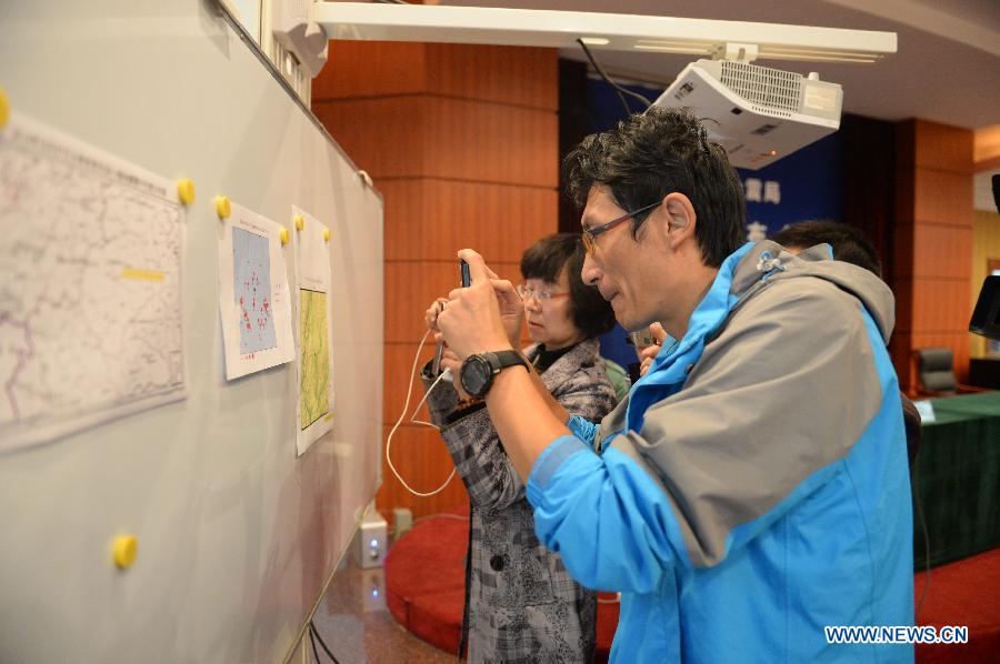 Two journalists take photos of the epicenter location map of Jinggu County earthquake at the Seismological Bureau of Yunnan Province in Kunming, capital of southwest China's Yunnan Province, Oct. 7, 2014. A 6.6-magnitude earthquake jolted Jinggu County of Pu'er City in Yunnan at 9:49 p.m. Beijing Time (1349 GMT), according to the China Earthquake Networks Center (CENC). (Xinhua/Hu Chao) |