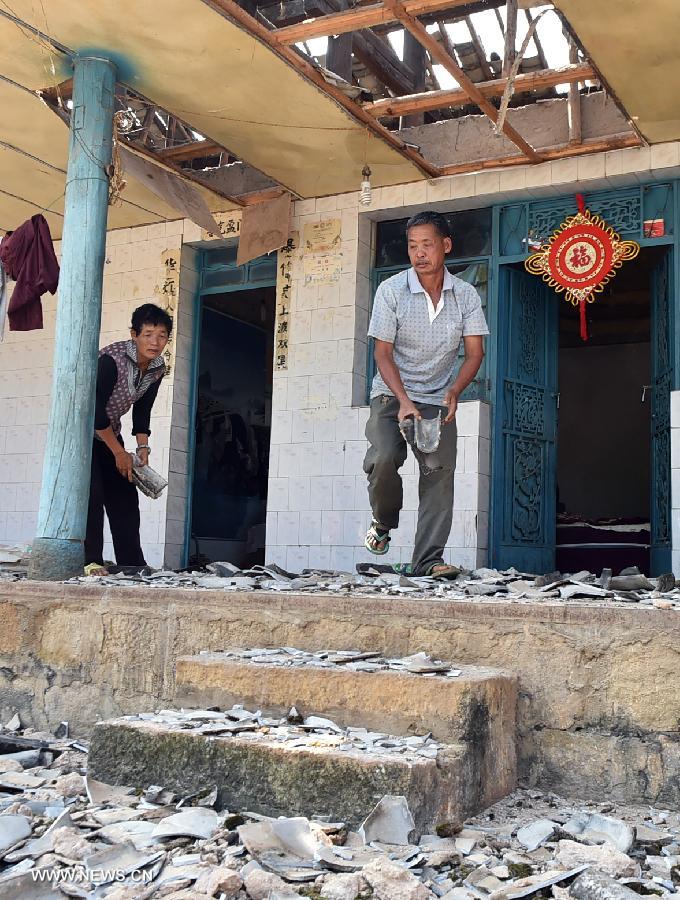 Villager Xu Yongqin (L) cleans up bedclothes in the collapsed house in Mangfei Village under Yongping Township at Jinggu County of Pu'er City, southwest China's Yunnan Province, Oct. 8, 2014. One person died and 324 others were injured after a 6.6-magnitude quake jolted Yunnan Province Tuesday night, according to local government. A total of 6,988 houses collapsed while 13,017 ones were severely damaged. (Xinhua/Chen Haining)