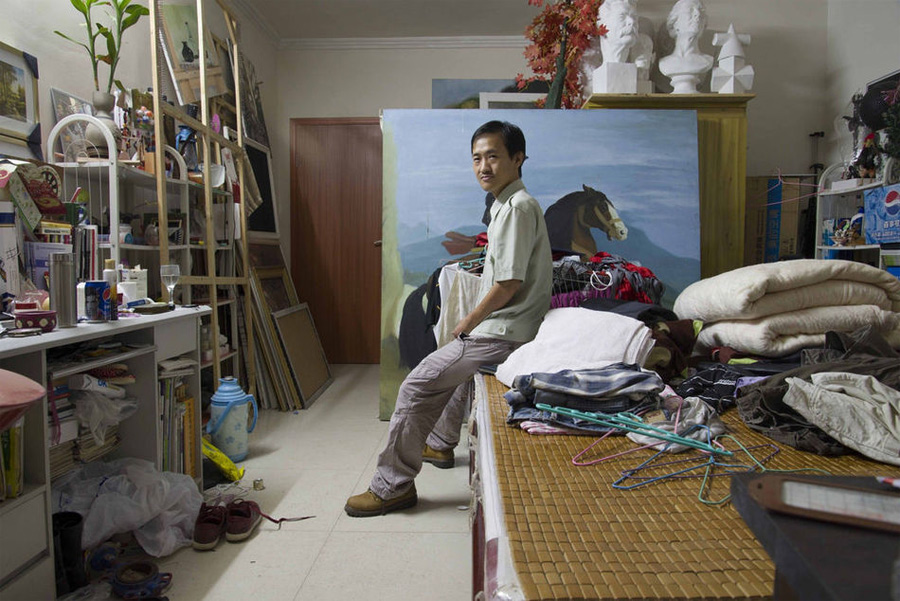 A student majoring in oil painting creates art works in his messy room. (Photo/cankaoxiaoxi.com)