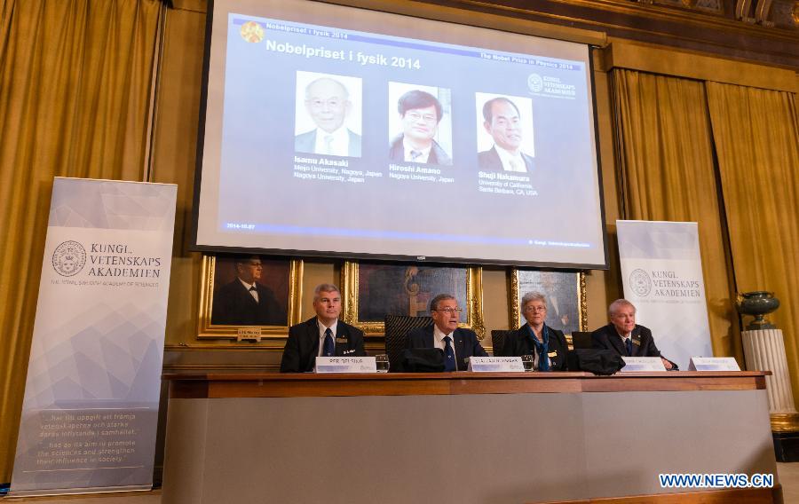 Staffan Normark (2nd L), permanent secretary of the Royal Swedish Academy of Sciences, announces the winners of the 2014 Nobel Prize in Physics, at the Royal Swedish Academy of Sciences in Stockholm, capital of Sweden, Oct. 7, 2014. Isamu Akasaki and Hiroshi Amano of Japan and Japanese-born U.S. scientist Shuji Nakamura won the 2014 Nobel Prize in Physics for their invention of blue light-emitting diodes, a new energy efficient and environmentally friendly light source, the award-giving body announced Tuesday. (Xinhua/Shi Tiansheng)