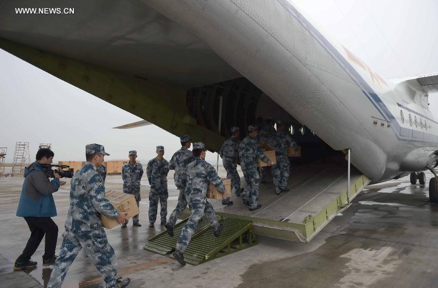 Soldiers load medical supplies for quake-hit areas at the Qionglai Airport in southwest China's Sichuan Province, Oct. 8, 2014. Medical staff and supplies from Chengdu Air Force have arrived at the Jinggu County on Wednesday. A 6.6-magnitude quake jolted Yunnan Province Tuesday night. (Xinhua/Xue Yubin) |