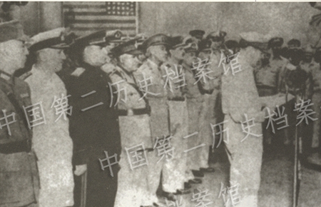 General of the Army Douglas MacArthur read his speech at the surrender ceremony on Sept. 2, 1945.(Photo/Second Historical Archives of China) |