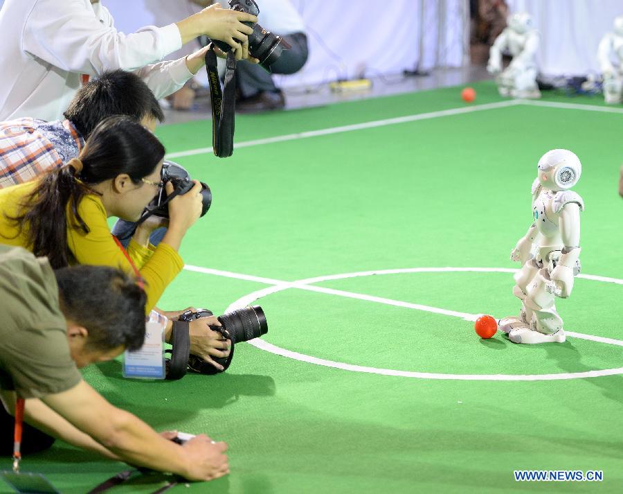 Press photographers take photos of a robot during the 2014 China Robot Competition and the Robocup China in Hefei, capital of east China's Anhui Province, Oct. 10, 2014. Over 2,000 contestants from colleges and universities took part in the competition. (Xinhua/Guo Chen) |