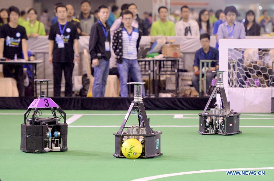 Robots play football during the 2014 China Robot Competition and the Robocup China in Hefei, capital of east China's Anhui Province, Oct. 10, 2014. Over 2,000 contestants from colleges and universities took part in the competition. (Xinhua/Guo Chen)