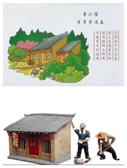 Most bungalows have a cross-section that consists of an inverted V placed on top of a square, but bungalows in Shaanxi generally have a cross-section that is exactly one half of what you would get if a conventional bungalow was cut widthwise. The tradition of building bungalows this way is believed to have originated either from the fact that a bungalow thus built could make almost all the rainwater falling onto the roof flow across the area in front of the house, to the benefit of the house owner, which was vital given Shaanxi's status as a drought-prone region with little rainfall, or from the fact that there had been a shortage of houses in Shaanxi because there were only limited amounts of land but a rather large population there.