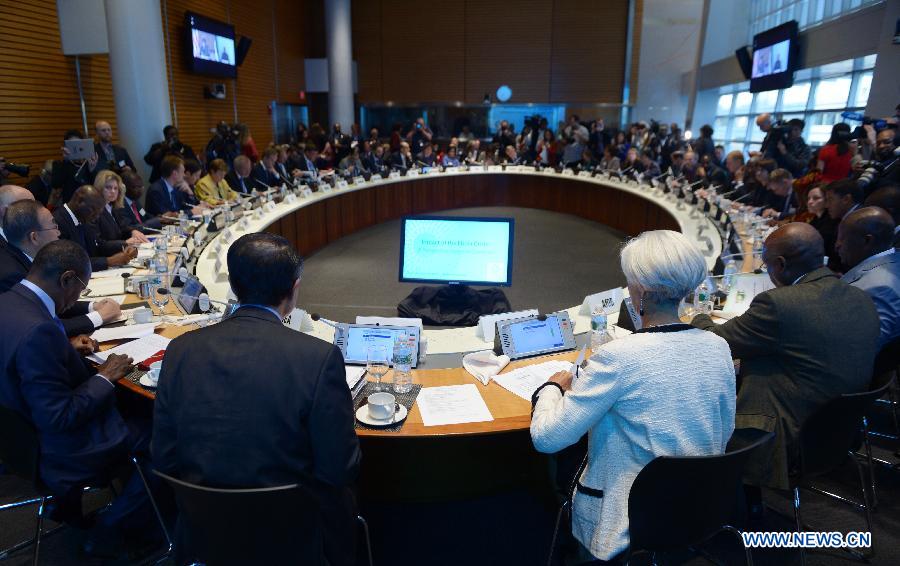 Christine Lagarde(R, C), Managing Director of International Monetary Fund and Jim Yong Kim(L, C), President of World Bank Group attend a meeting discussing the Ebola impact, possible solutions and how to support countries affected by the Ebola crisis, at the World Bank in Washington D.C., the United States, Oct. 9, 2014. (Xinhua/Yin Bogu) |