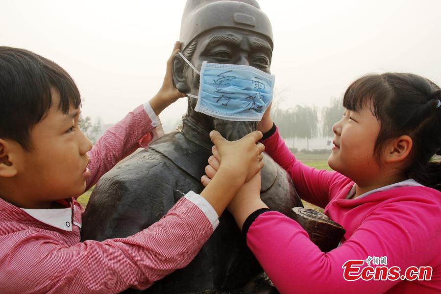 Children put mask on a sculpture to ‘protect’ it from smog during an environmental awareness campaign at their school in Guangping county, North China’s Hebei province on Friday, October 10, 2014. Widespread smog has affected a large swath of north China as well as northwest China's Shaanxi province since Wednesday, with air conditions in northern Chinese cities including Beijing and Tianjin severely downgraded. [Photo: China News Service/ Cheng Xuehu] |