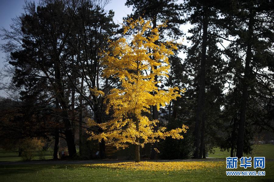 A ginkgo tree and fallen leaves in Geneva, Switzerland. (Xinhua/AFP)