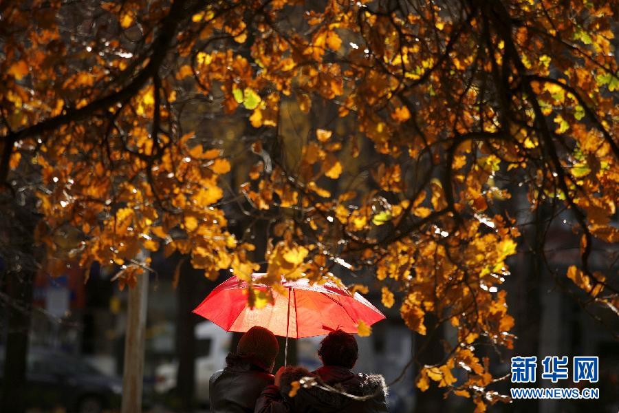 A tourist holding a red umbrella enjoys autumn scenery in Sofia, capital of Bulgaria. (Xinhua/Reuters)